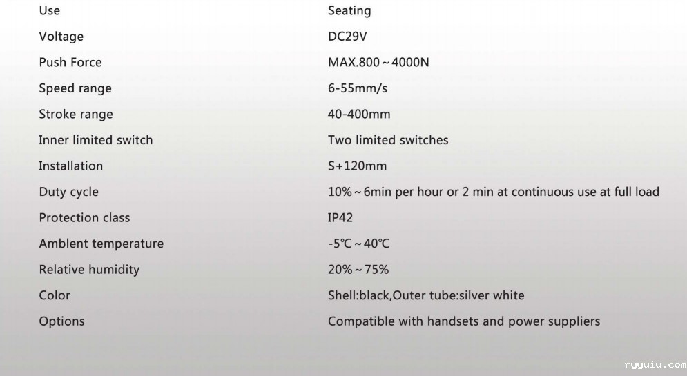 本产品已通过CE、UL、PSE、ISO9001认证,它有一个新颖的外观和制作精良,噪音小,操作简单,让它成为畅销国内外,被广泛用于电动沙发、医疗床、手术床,按摩椅等。