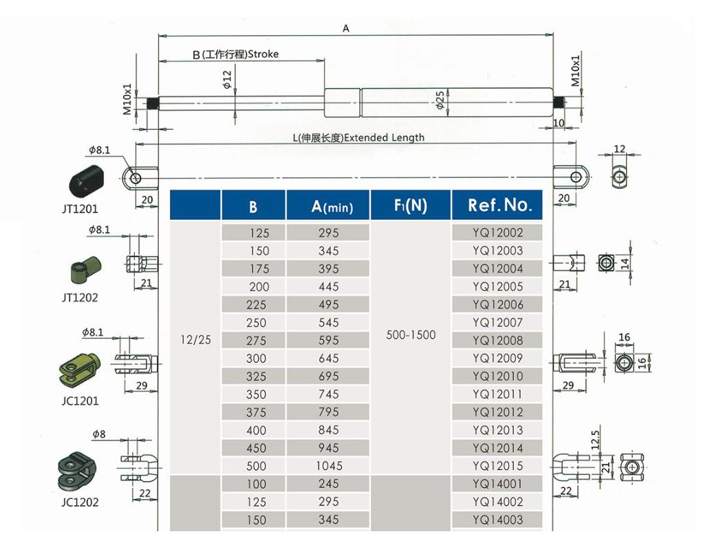 注:由于气弹簧是非标准的,以上仅为型号的一部分。我们可以根据客户的要求定制。