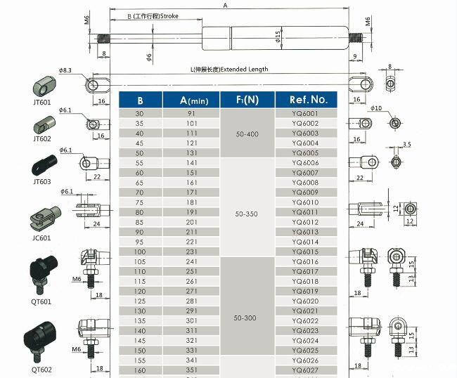 注:由于气弹簧是非标准的,以上仅为型号的一部分。我们可以根据客户的要求定制。