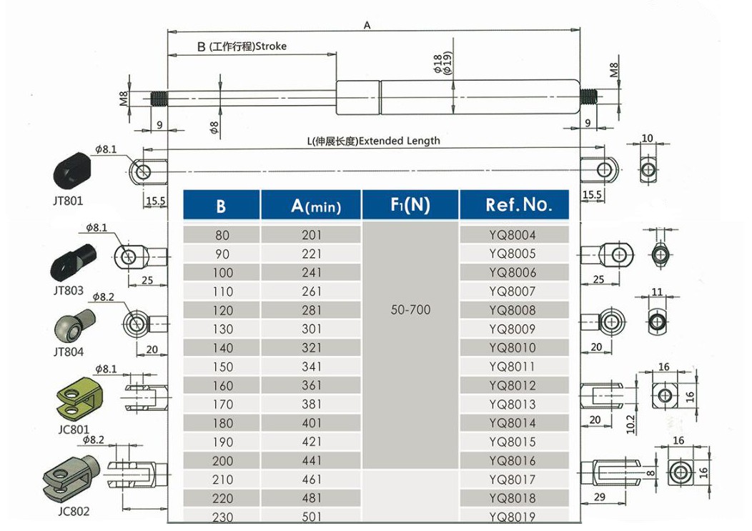 注:由于气弹簧是非标准的,以上仅为型号的一部分。我们可以根据客户的要求定制。