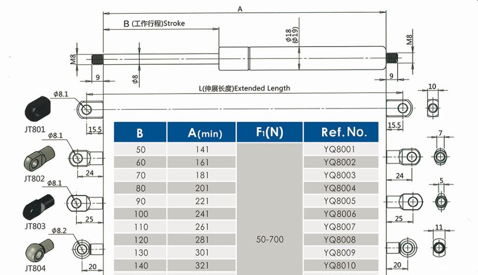 注:由于气弹簧是非标准的,以上仅为型号的一部分。我们可以根据客户的要求定制。