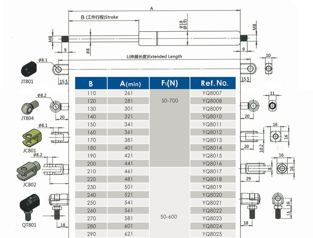 注:由于气弹簧是非标准的,以上仅为型号的一部分。我们可以根据客户的要求定制。