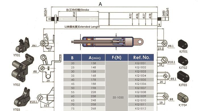 注:由于气弹簧是非标准的,以上仅为型号的一部分。我们可以根据客户的要求定制。