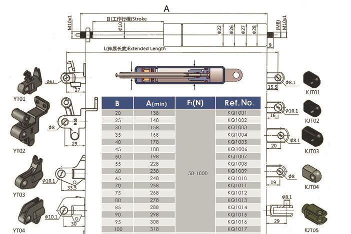 注:由于气弹簧是非标准的,以上仅为型号的一部分。我们可以根据客户的要求定制。